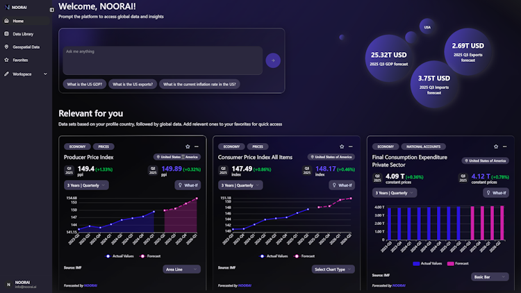 NOORAI Platform is a AGI platform designed to unify access to economic and financial data. It enables users to explore indicators from trusted sources such as the IMF, OECD, FRED, and SEC through natural language queries or visual browsing on a global map. Additional capability for Enterprises private data can be securely ingested into the platform for visualization and forecasting. With predictive analytics and intelligent What-If simulations, the platform empowers users to test scenarios and forecast trends.