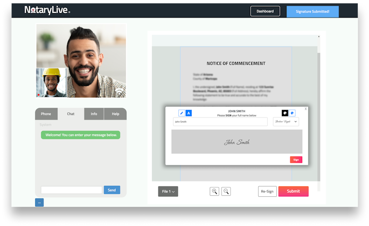 NotaryLive is a remote online notarization platform that enables legally binding notarizations through secure video conferencing technology. The software manages the entire notarization process digitally and removes the need for physical presence at a notary office or scheduling in-person appointments. The solution serves individual consumers with occasional notarization requirements and business organizations with high-volume needs across industries such as automotive, construction, financial services, insurance, legal, education, real estate and vital records management. The platform operates continuously and provides services valid in all fifty states by connecting participants with state-licensed notaries through a structured digital workflow.
