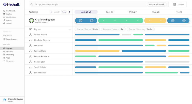 Offishall Planning allows users to (re)create social links by allowing teams to easily find each other in the office. It helps visualize who is where, when. Users can organize their upcoming office space weeks with a user-friendly platform. Users can see when their colleagues and teams are in the office and can plan accordingly. They can see if they come to the office, if they are teleworking or if they are working at a third location.