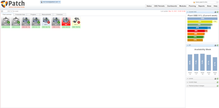 - Real-Time Production Progress: Patch OEE bridges the gap between planning in ERP and the automation layer on the shop floor to gain visibility into production runs in real-time.