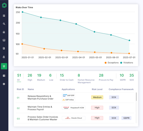 Critical business processes such as procure-to-pay, order-to-cash, and hire-to-retire are monitored for anomalies, fraud, or policy violations. This visibility helps organizations protect financial integrity, improve operational resilience, and prevent costly errors.