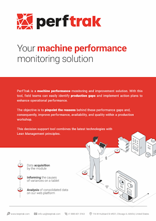 The software integrates with existing machinery through multiple connection options, including PLC signal retrieval, sensor placement, or OPC UA protocols to detect production deviations based on standard production times. Operators interact with the system through an intuitive tablet interface that allows for real-time documentation of performance issues according to customizable loss trees. PerfTrak extends beyond basic monitoring to include form digitization, scrap management, and production animation tools. The supervision platform delivers comprehensive analytical capabilities including performance history tracking, real-time workshop supervision, Pareto analysis of downtime causes, automatic production reports, and instant machine condition monitoring.