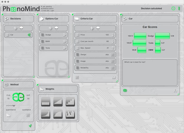 PhaenoMind Entscheidungen is a program that helps you make decisions. Your decisions will be methodically and professionally calculated, documented, and explained. It allows quantitative determination of the optimal alternative and qualitative comparison of all options based on criteria. PhaenoMind can compute all interconnected decisions simultaneously until a viable logical result is determined.