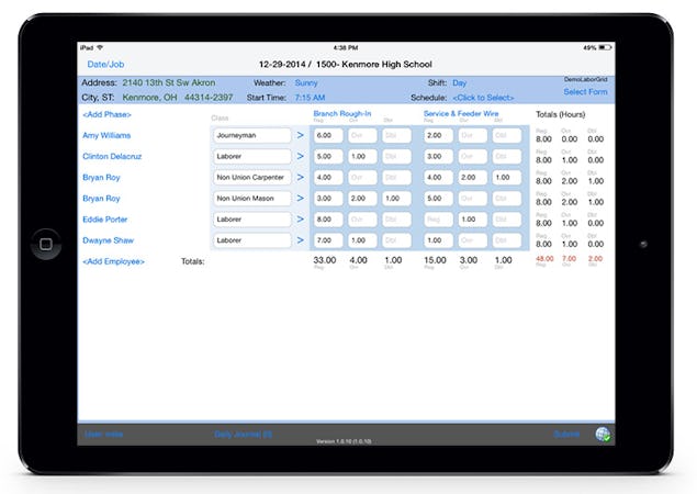 Use mobile devices to quickly record clock-in and clock-out times and allocate labor to jobs and cost codes. Mobile time entry provides managers and office personnel daily visibility to job labor while eliminating the office key entry.