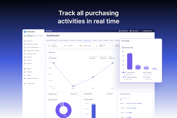Precoro is a cloud-based solution for procurement centralization & automation. It unifies your procurement operations, eliminates manual work, prevents maverick spend and drives savings — faster than you think. Save 5% of every dollar spent by centralizing procurement data, identifying cost-saving opportunities, and eliminating duplicated payments. - Procurement: Build stronger relationships with suppliers, store contracts, and simplify requesting for employees. Gain full visibility into spending, manage POs, orchestrate approval routings, and collaborate with suppliers in one tool. - AP Automation: Save time at each stage of invoice processing with AP inbox, AI-powered OCR, approval workflow, 3-way matching, reporting, integrations, and budget control. - Spend Management: Seamlessly navigate budgets across locations and departments, manage expenses, and generate reports for insightful analysis. Monitor budget usage to leverage data-driven insights that enhance business profitability. - Supplier Management: Automate vendor onboarding and approval to mitigate possible risks. Utilize a supplier portal for efficient communication and manage supplier information in a centralized repository. - Connect Precoro with ERP systems and business tools like NetSuite, QuickBooks Online, Xero, and Sage, or build custom connections using a free API. Eliminate duplicate payments and manual document handling. Precoro's user-friendly interface lets you forget about complex onboarding and long-lasting training. Precoro’s intuitive interface ensures onboarding in under 6 weeks - without IT involvement. Customize, scale, and manage with ongoing support from your dedacated Customer Success Manager (CSM). Keep all your data secure with SSO and reliable 2-factor authentication. Our privacy compliance program aligns with the General Data Protection Regulation and the California Consumer Privacy Act. Moreover, Precoro is SOC 2 Type II compliant, ensuring the utmost protection for all your sensitive data.