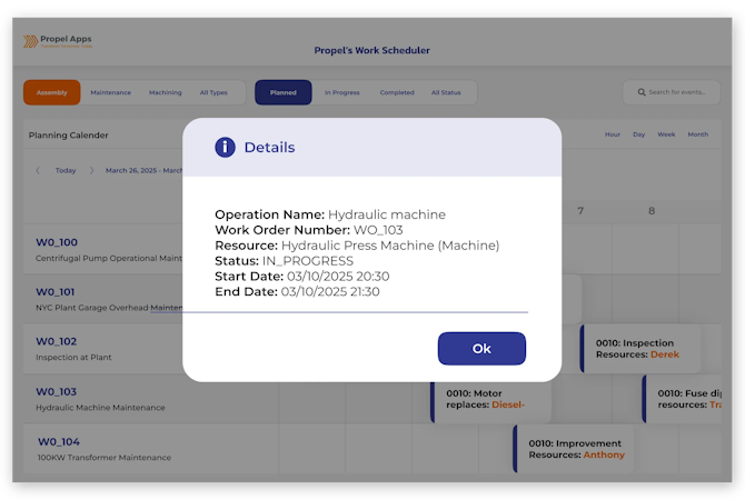 Propel Apps Smart Scheduler is a web-based maintenance planning and scheduling platform that optimizes work order management, resource allocation and technician coordination for plant maintenance operations. It equips planners and schedulers with comprehensive tools to manage maintenance processes through an intuitive calendar interface that facilitates efficient task execution and workflow alignment. The platform supports operations managers, maintenance supervisors, plant managers, engineering teams and IT managers in industrial and manufacturing environments where coordinated scheduling and resource management are essential to operational continuity. The solution integrates task management and schedule oversight within a unified visual framework.