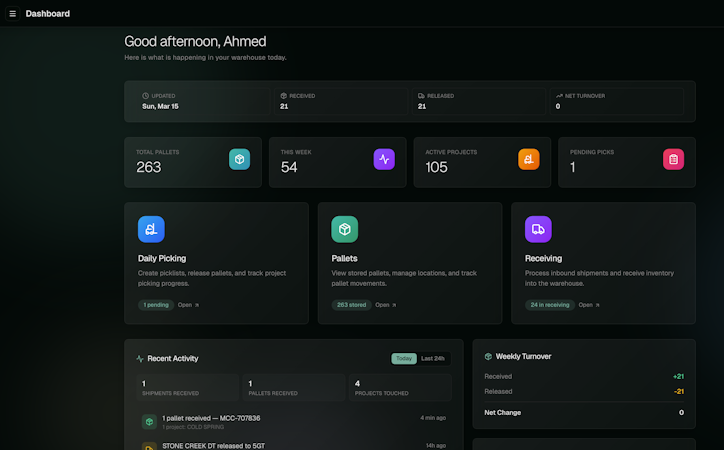 The platform offers comprehensive receiving workflows that scan pallets at dock doors and automatically capture project assignments, location data and timestamps without clipboard documentation or later data entry. Pallet lifecycle management functionality tracks inventory movements from receiving through staging, including move operations, release workflows and return processing, with each transaction reflected instantly. A project picklist feature consolidates daily picking operations into unified workflows that display all required pallets for multiple projects alongside dock assignments and scheduled departure times. Integrated barcode label generation and printing capabilities ensure pallet identification at the point of receiving, reducing mislabeling incidents and rework. A central dashboard provides live visibility into pallet counts, inventory value, project status, inventory categories and daily activity summaries, removing reliance on batch report generation. Role-based access controls and transaction audit trails provide complete traceability of inventory movements, while CSV export functionality supports external reporting and analysis needs.