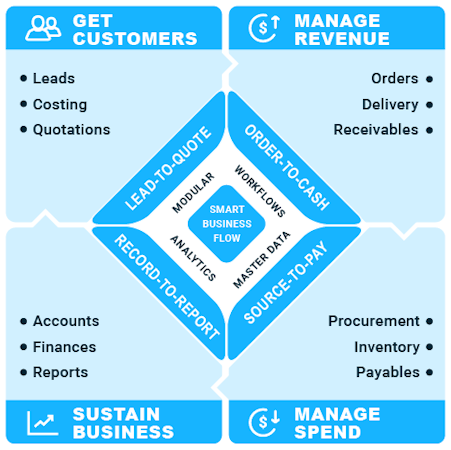 6. Seamless Workflow Support: Support for end-to-end business flows like Lead-to-Quote, Order-to-Cash, Purchase-to-Pay, and Record-to-Report ensures smooth operations from customer acquisition to financial reporting.