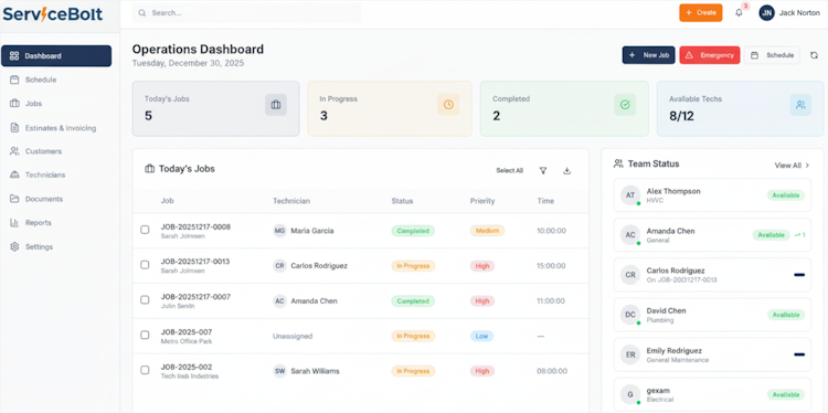 ServiceBolt is a field service management software platform that centralizes operational workflows for service-based businesses in the HVAC, plumbing, electrical and appliance repair industries. It consolidates job scheduling, technician dispatch, work order management, customer relationship management and financial operations into a unified digital environment. The solution addresses the needs of organizations that manage multiple technicians across various job sites while requiring real-time visibility into job status, technician availability and performance metrics.