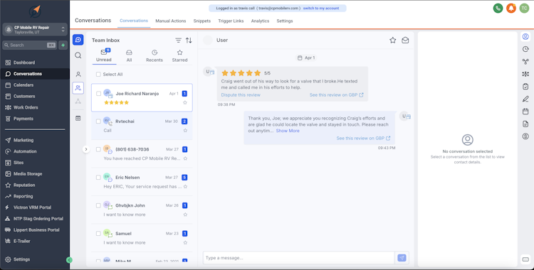 The platform functions as a unified operating system rather than a suite of disconnected applications. Workflows are tailored to RV specific job types, diagnostic procedures, component complexity, warranty and contract processing and multitechnician staging requirements. Real-time insights are generated through AI analysis of operational patterns to identify growth opportunities and efficiency improvements. Smart follow-up automation ensures systematic customer engagement without manual oversight and supports diverse service models including fully mobile operations, shop-based businesses, hybrid models, independent dealerships and specialized energy installation services.