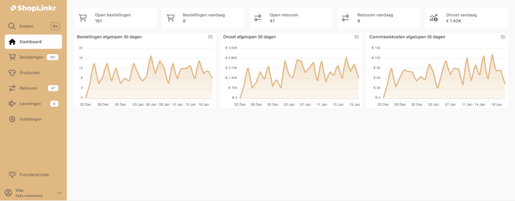 Provides clear overview of key data like orders, returns, daily revenue, and fees