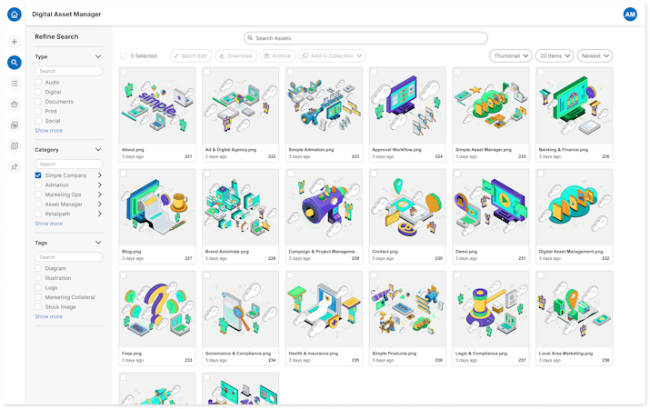 Simple Asset Manager is a digital asset management tool designed to help distribute brand assets securely and efficiently, while meeting compliance standards. The tool allows managers to define asset workflows, permissions, and approvals. With file sharing capabilities, it enables collaboration between internal teams and external agencies. Simple Asset Manager serves as a central repository for all digital assets with features for categorization, tagging, OCR-enabled search, brand-aligned templates, and more.