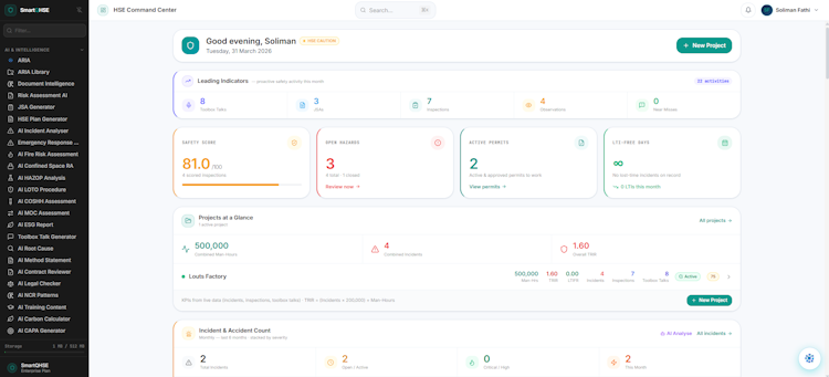 The platform comprises more than one hundred twenty modules covering the complete health and safety lifecycle. It features an AI-powered enterprise intelligence copilot named ARIA, which generates risk assessments, job safety analyses, incident root cause analyses, legal compliance checks, and reports in seconds by analyzing site documents, live data, and project history. Incident management includes AI-assisted root cause analysis and automated corrective and preventive action generation. Digital inspections and audits feature AI hazard scoring and automatic report creation. Risk assessment tools produce hazard identification risk assessment matrices aligned to ISO three thousand one hundred standards. Multi-level digital permit-to-work systems provide isolation certificates and live tracking. Training management encompasses course tracking, certification monitoring, and expiry alerts. Real-time analytics dashboards display key performance indicators, safety trends, and executive reporting across sites.