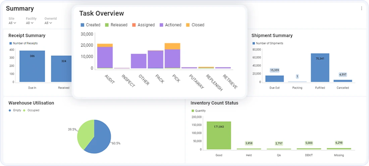 - Gain real-time visibility into inventory, orders, and warehouse activity, using built-in dashboards and reporting to monitor performance, identify bottlenecks, and support better decision-making.