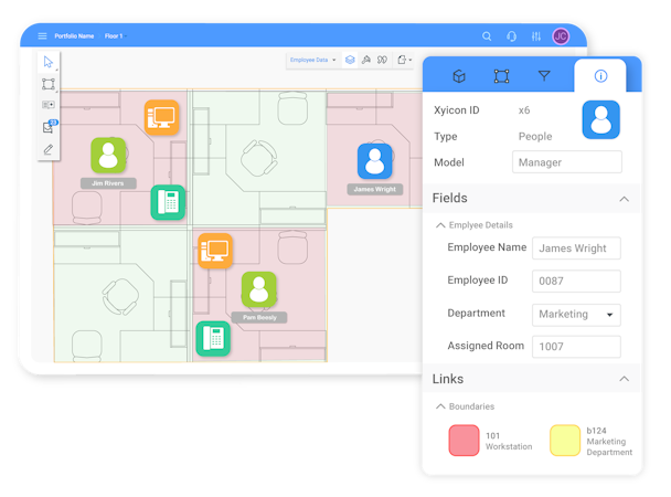 Xyicon is a web-based planning & management solution that visualizes equipment, assets, and other data on any virtual image, map or floor plan. Users can track and relate information about assets in spaces such as information including warranties, maintenance performed, part numbers and serial numbers in one place.