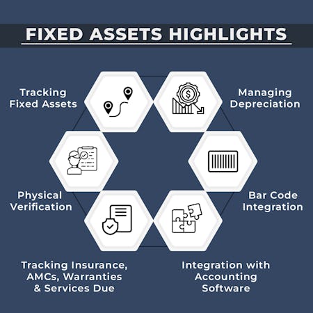 Key features include asset tracking, depreciation (as per IT Act, Company Act & Management Act), barcode or RFID integration, insurance, AMCs, warranty and service due tracking, document attachment, report writing, multiple-level workflow, and more.