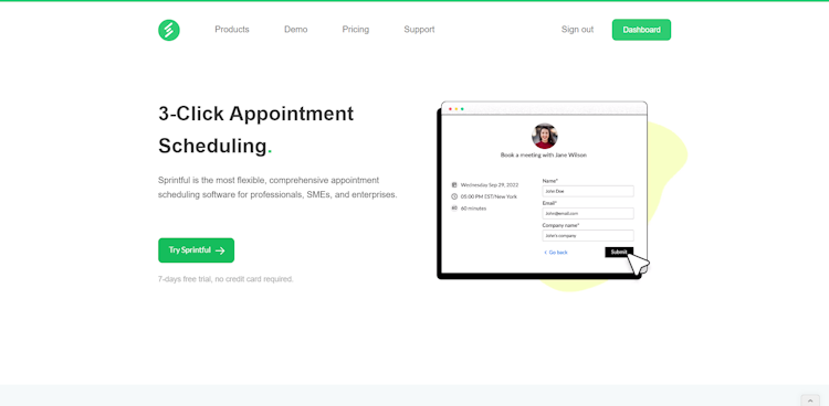 Sprintful is a cloud-based scheduling solution that helps professionals, SMEs, and enterprises manage appointment schedules. The platform offers various features including branding, calendar sync, video conferencing, and booking forms, to streamline the process of scheduling one-on-one meetings, group sessions, and team appointments. Sprintful also facilitates integration with various platforms such as Google Calendar, Outlook Calendar, Zoom, Salesforce, and more. Additionally, it enables users to control the number of attendees per session, setup recurring events, and add custom CSS to pages.