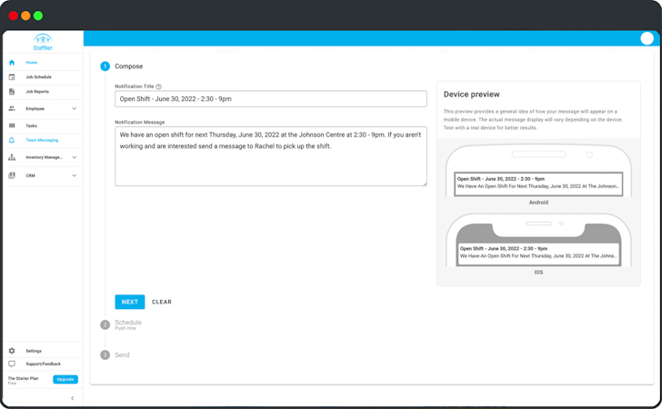 With the app, businesses are able to use StaffNet and be in several places at once. With an easy to use check-in/out feature within the app, employees can log work time and breaks as well. From the administrator's view the ability to oversee all the active jobs will enables managers to keep tabs on all jobs at once. When a job is completed, employees are able to submit a job report as well via the app and are able to upload media files to be saved on the cloud.