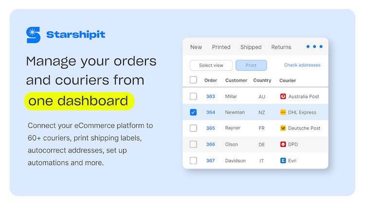 Forget chaotic, tedious or painful fulfilment processes; Starshipit has everything you need to effortlessly manage your online orders so you can spend more time working on your business, not in it. Starshipit is the leading provider of integrated and automated fulfilment solutions for retail businesses of every age and stage. Integrating with a large range of couriers and eCommerce platforms, Starshipit streamlines every step of your fulfilment process, reduces handling time, minimises human error, and improves customer experience.
