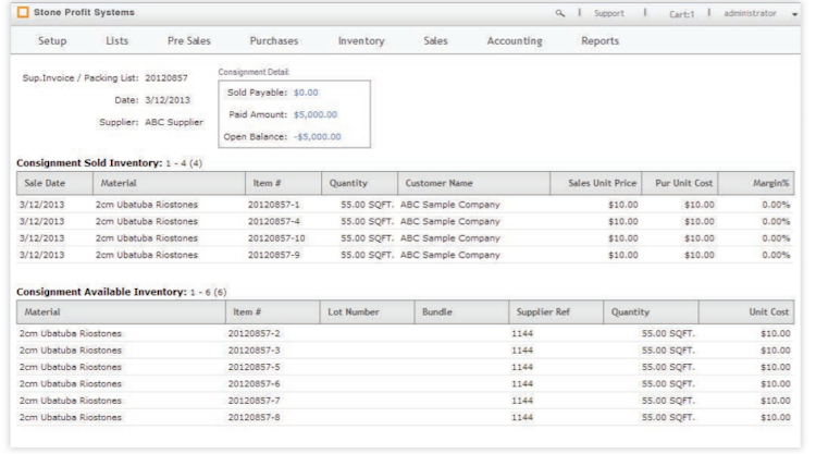 The application enables distributors to assign inventory consignment locations to clients and determine the profitability and average shelf life of items in each consignment through the analysis engine. Wholesalers can print labels and record various details about products present on-hold such as retailer names, date of creation/expiration, and required slab types. Businesses can also store a variety of information about slabs related to purchasing or sales history, landed costs, or selling price.