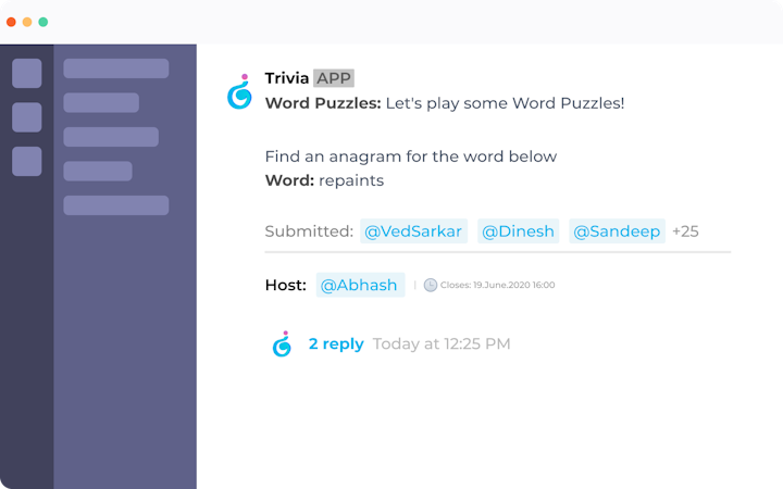 Trivia is a gamification add-on designed to help businesses using Microsoft Teams, Slack and Google Chat improve collaboration and communication among remote teammates through social games such as quizzes, word puzzles, custom polls, Pictionary, and more.