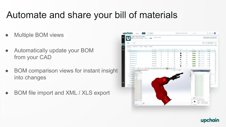 Upchain is a cloud-based Product Data Management (PDM) and Product Lifecycle Management (PLM) solution promising rapid deployment and adoption for product innovators across any industry sector. Priced over three SaaS packages spanning Lite, Standard and Professional that scale Upchain's features for greater service flexibility, the browser-based software boasts its own integrated 3D CAD viewer. Model files of over 25 formats can be imported and collaboratively worked on by all team members, allowing for markup, commenting and supporting document uploads. Cross-CAD compatibility then integrates the system with popular third-party CAD software such as AutoCAD, facilitating data synchronization that includes Bill of Material (BOM) being linked automatically to underlying CAD metadata.