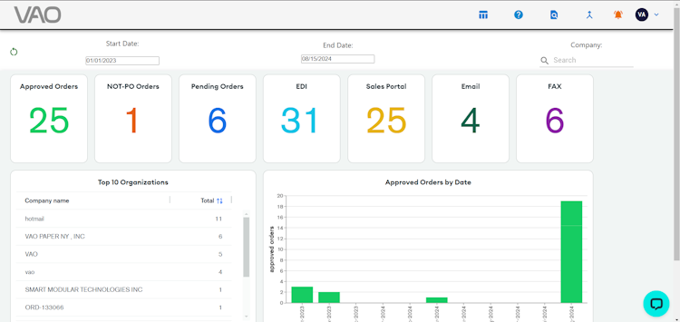 The software helps handle orders in multiple languages and from multiple channels, including EDI, sales portals, email, and fax. By having all order data in one centralized location, businesses can eliminate the complexity of managing multiple systems and streamline the chances of orders being missed or delayed. VAO provides tracking capabilities, allowing users to monitor the status of every order in real time. It also enables teams to address potential issues or delays. Key features include customizable statistics and dashboards, historical data and predictive AI insights generation.