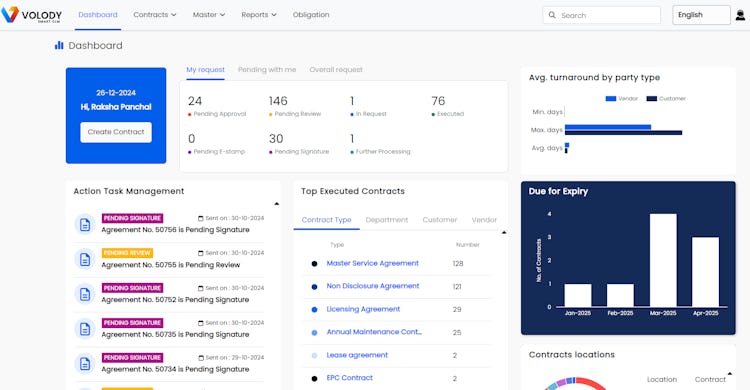 Trusted by 200+ global industry leaders like Honda Cars, Colgate, AstraZeneca, Adani, etc. Volody CLM by Volody is an Agentic AI-powered Contract Lifecycle Management (CLM) platform built to revolutionize how your enterprise handles contracts. We are proud to be known as one of the most user-friendly and easy-to-use tools on the market, helping organizations achieve tangible results like an 84% reduction in contract turnaround time and a 70% boost in team productivity.