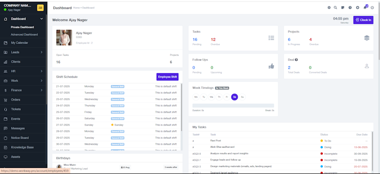 Workway.pro is a software that enables businesses to manage their entire operations—from HR, payroll, project tracking, client, finance, and team collaboration. It offers integrated modules to centralize and automate day-to-day operations. It is designed for startups, agencies, IT firms, recruitment companies, and service-based businesses. It helps onboard employees, track attendance, generate payroll, manage shifts, and run projects with tasks, deadlines, and time logs.