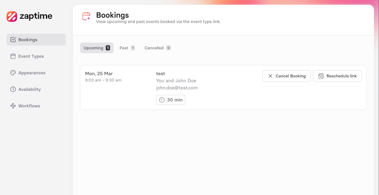 Zaptime is a scheduling software that enables personalized scheduling of meetings and calls. It connects to Google Calendar and iCloud Calendar to let people find and book their time slots, but only when they are actually available. This eliminates the back-and-forth of emails when scheduling meetings.