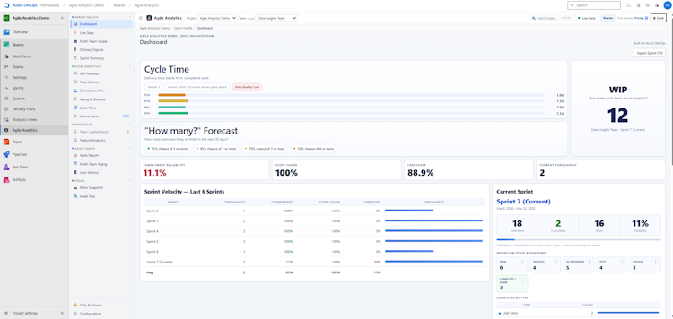 The sprint intelligence functionality provides velocity tracking, scope change analysis, carryover monitoring, burndown visualization, team health indicators, and automated alerts consolidated into unified views accessible across all teams. Sprint capacity planning capabilities read sprint dates, working days, team member availability, and individual capacity allocations directly from Azure DevOps Boards to calculate effective capacity metrics and generate recommended commitment levels. Flow metrics tracking includes cycle time measurement, cumulative flow visualizations, work in progress pressure monitoring, and throughput analysis that remain entirely within the Azure DevOps environment. The Monte Carlo forecasting feature executes probability based delivery predictions derived from historical throughput data enabling teams to establish confidence ranges rather than single point estimates for delivery conversations. Cycle time analytics deliver percentile based reporting views, aging work visibility, and flow analysis designed for engineering leadership focused on throughput optimization and predictability improvement. The work in progress monitoring system provides real time visibility into overloaded workflow columns, blocked work items, and aging in progress tasks before delivery risk accumulates. Operational alerting capabilities detect work in progress threshold breaches, stale work conditions, sprint risk indicators, and generate weekly digest notifications. The software includes artificial intelligence driven coaching functionality operating with user supplied API credentials, rollout insight tracking, and maintains feature parity across all licensing tiers without feature gates or tier based restrictions. Executive reporting capabilities support export to portable document format and presentation slide formats for stakeholder reviews and leadership reporting requirements. The user interface supports dark mode presentation and includes configurable item type settings to accommodate varied workflow taxonomies.