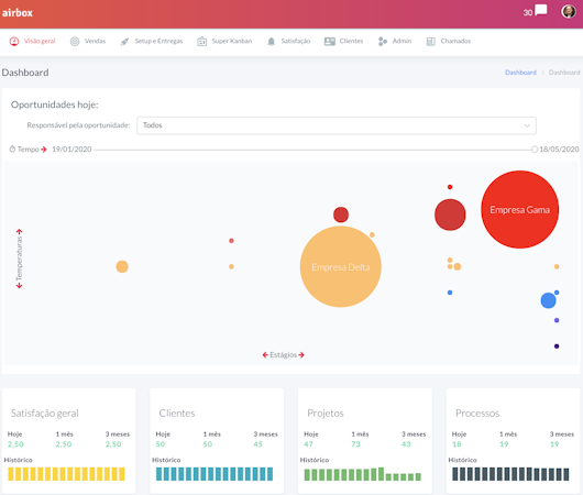 Airbox is a Portuguese-language task, project, and business process management solution that provides a 360º view of the most relevant operations, monitors each stage of the sales funnel, and tracks the history of business opportunities while also measuring the performance of predefined goals. The platform's features include Super Kanban, a centralized screen where the manager can visualize the agreed deliveries using cards, with options to filter them by project, client, employee, and more. Airbox also provides a continuous feedback mechanism so that the company can track the level of customer satisfaction at each stage of the process.