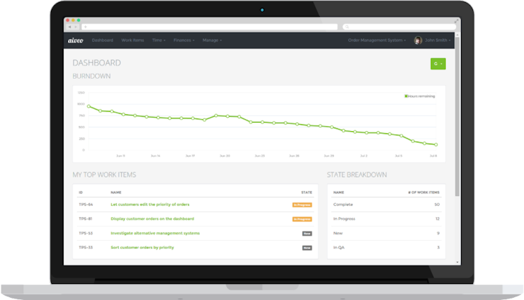 Aiveo presents work items to users in a task board, giving an overview of the state of each task, which are color-coded. Issues can be sorted and filtered based on their priority, type, or estimated time, and also searched for directly. Custom issue types can be added, as well as custom sets of work item states. Issues can be organized into milestones with assigned dates, allowing users to track progress towards each milestone with the burndown chart on the dashboard. Project requirements, high level goals, and user stories can be managed and tracked using objectives to group related work items. Time spent on individual issues can be recorded and viewed on built-in timesheets, and users can monitor week-by-week progress on projects.