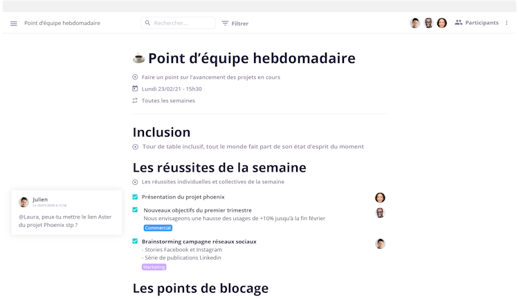 Aster is a collaborative space that centralizes notes, decisions and tasks to help you be more efficient in meetings and successfully manage your team, your projects and your time. Follow the implementation of your decisions and action plans to effectively manage the performance of your business and increase the impact of your committees and meetings. Even remotely.