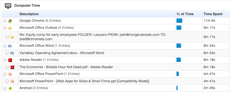 For example, when you send an email, Chrometa will report back that you sent a Gmail message. It will also log the To/From and Subject Line of the email, and it will tell you how long you spent composing the email.