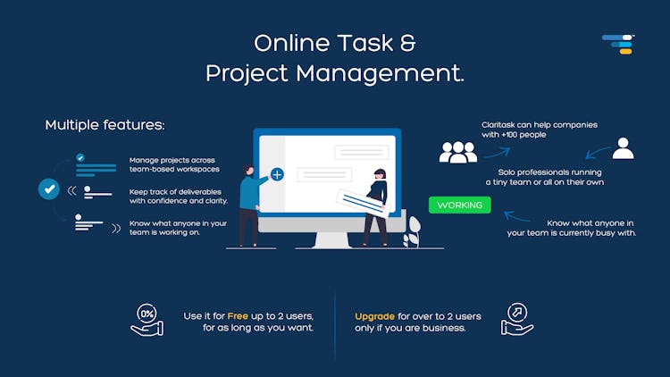 Claritask is a project management platform that helps businesses organize projects and delegate tasks according to requirements. The system improves team efficiency and productivity from small startups to large enterprises.