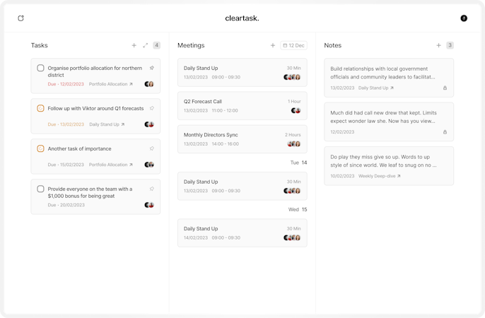 Cleartask is a cloud-based productivity tool that helps users manage meetings, tasks, and notes for their teams. Users can schedule, track, and follow up on meetings, ensuring that every interaction is planned accordingly.