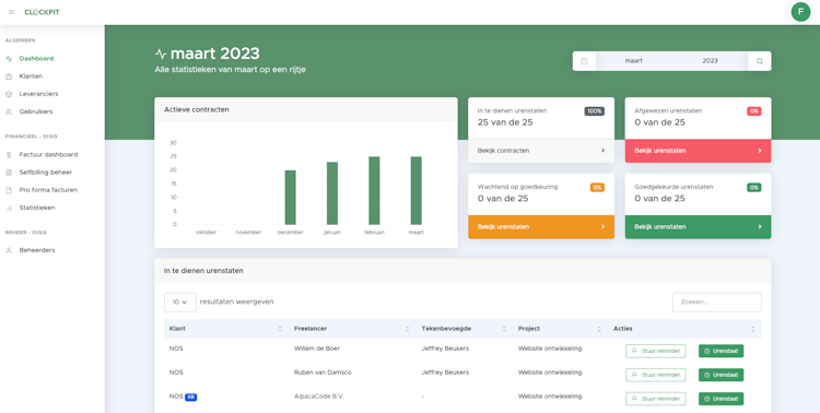 Clockpit is an intelligent time registration and contract software for intermediaries and secondment companies. Professionals can easily record hours worked. These hours can be approved by the customer, after which the intermediary or secondment company can invoice the hours. Managers can have an overview of all active contracts and timesheets at all times. Key features include: