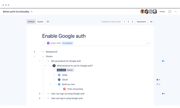Solving the documentation and collaboration needs of software development teams and product managers that conventional document editors do not meet. Delibr is an outliner, which means huge amounts of information can be stored, organized, structured, and accessed in infinitely nested bullets. Product managers are able to navigate communications with different stakeholders with precise control, zooming into detail or zooming out for a high-level overview. Further, the presentation mode converts documents instantly into presentation-ready slides with the selected information. Backed with a full set of collaborative features ratings and decision tracking to encourage conversations around feature discovery and delivery. Modular PRD templates with user story mapping live on fully customizable kanban boards with aggregated information for a quick overview of the status of all epics.