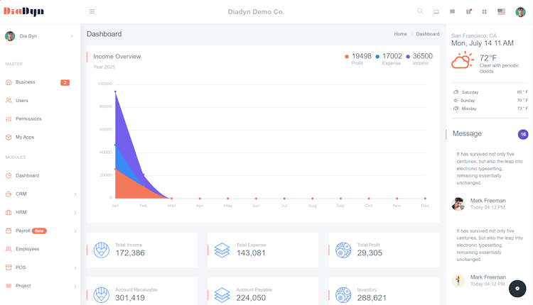 Diadyn offers a comprehensive suite of cloud-based business applications and services, including CRM, HRM, POS, billing, accounting, finance, tax, inventory, project management, helpdesk, task management, cloud servers at multiple global locations, hosting solutions, domains, Webmail, WordPress websites, and SEO services. The Diadyn CRM solution automates follow-up reminders to ensure no important tasks or appointments are missed, while the centralized contact management system consolidates customer information and communication history for relationship management.