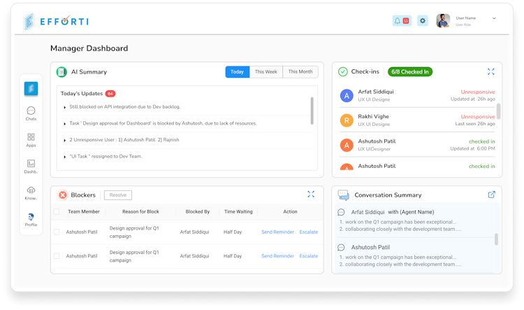 Efforti is an artificial intelligence based team productivity solution designed for mid sized to large companies seeking enhanced leadership visibility and streamlined team management. The platform functions as a leadership assistant by delivering real time insight into team activity, workloads, and project progress without reliance on status meetings or manual reporting. Efforti addresses organizational challenges such as meeting overload, misalignment between plans and execution, uneven workload distribution, delayed risk identification, and fragmented communication channels.
