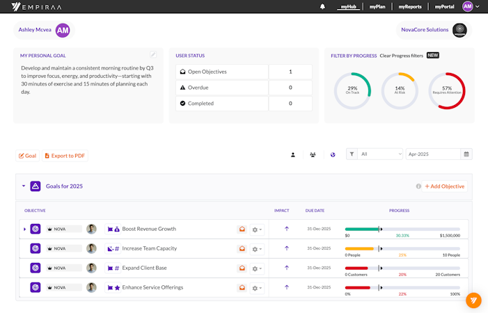 Empiraa is a cloud-based strategic planning platform that helps small to large businesses in human resources (HR), logistics, technology, hospitality, and other sectors turn their strategies into reality. It allows managers to coordinate their team's efforts toward achieving the strategy.