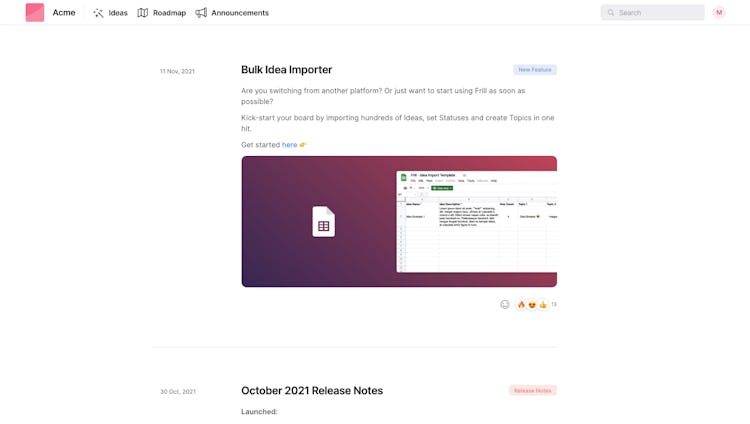 Frill is a cloud-based software designed to help businesses capture, manage, and announce product feedback via a unified portal. The platform enables organizations to gain insights into customers' experiences with products, providing real-time access to how customers are using and interacting with products.