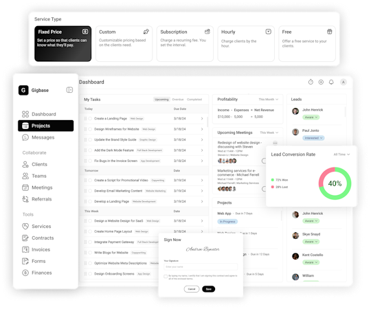 With Gigbase, you can sell freelance services, manage projects and clients, track time, send invoices and contracts, and get paid, all from one streamlined dashboard.