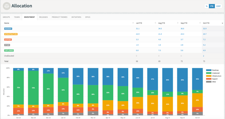 Jellyfish ingests all the engineering signals that engineers create in various tools—from commits and pull requests in Git to assigned tasks or issues resolved in JIRA. From there, Jellyfish pulls in contextual business data from tools like calendars, product planning tools, and HR software. By layering these different types of signals, Jellyfish assembles a comprehensive picture of what engineering teams are working on and when, all without changing their workflows in any way. It maps the investment of work and resources to different categories (projects, themes, releases, business objectives, market segments, etc.) to understand, for example, how much work is being dedicated to product roadmap and new feature development vs. scaling the infrastructure or fixing bugs reported by customers.