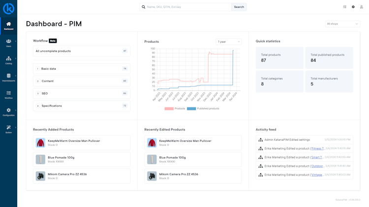 KatanaPIM is an advanced Product Information Management (PIM) solution designed to centralize and streamline every aspect of product data management. It provides businesses with a unified platform to collect, enrich, validate, and distribute product information across various channels, ensuring consistent and accurate data. KatanaPIM integrates seamlessly with a variety of third-party systems, including ecommerce platforms, ERP systems, and WMS, making it a crucial component for optimizing and enhancing your technology ecosystem.