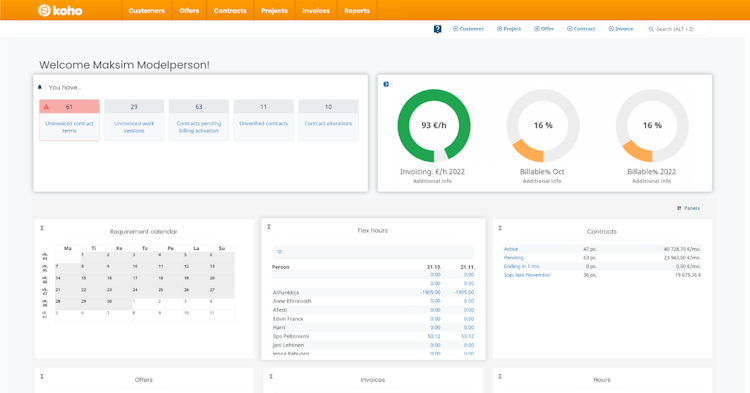 With Koho PSA you can effortlessly manage your clientele, create tenders and contracts, manage recurring tasks, balance employee workload, automate invoicing and dive in various reports. You can also collaborate with your clients easily.
