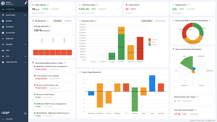 LEAP’s core functionality centres on operational visibility and predictive intelligence across the services business lifecycle. Lead management and pipeline features enable organisations to track opportunities from initial contact through conversion while project management tools support task tracking, staff assignment, resource allocation and worklog documentation for complex multi-client engagements. Native timesheet functionality links directly to billing processes to ensure that performed work translates accurately into invoices and revenue recognition. Forecasting and analytics capabilities surface delivery and revenue risks, identify projects requiring attention and enable leadership teams to prioritise resources based on current operational data rather than static reports. Business planning features allow the establishment of standardised workflows alongside adaptations for client-specific requirements. Highlights and prediction capabilities analyse patterns across projects, resources and financial performance to identify issues before they impact delivery timelines or revenue targets, providing decision-ready insights without manual data interpretation.
