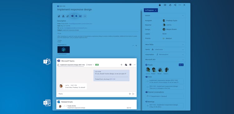 Whether you're leading a project, handling support tickets, or driving DevOps workflows, this integration connects your work across Jira and Microsoft 365. Use Outlook, Microsoft Teams, and To Do in tandem with Jira to keep your entire workflow in sync.