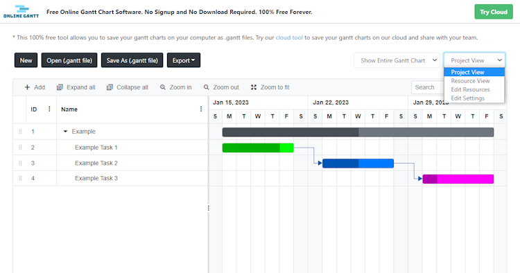 Simple and affordable gantt chart software. Our 100% free version allows users to save gantt charts as individual files. Our cloud version allows users to save on our cloud and share with their teams.